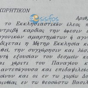 Συγχωρητικόν Γράμμα, απόσπασμα αλληλογραφίας με Πατριαρχείο Κωνσταντινουπόλεως