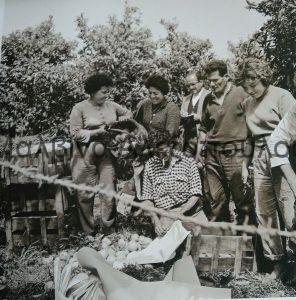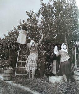 Οι σκάλες, τα κοφίνια, τα μαντήλια, η προσοχή χαρακτηρίζουν την κοπή των πορτοκαλιών στην εύφορη από την παλιά Κόρινθο (δεκαετία ’50).