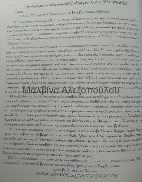 Το παρακάτω υπόμνημα – επιστολή είχε στείλει ο Εμπορικός Σύλλογος Κιάτου στις 10 Ιουλίου 1945 προς το Υπουργείο Οικονομικών: