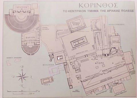 Στον χάρτη μπορούμε να δούμε το κεντρικό τμήμα της Αρχαίας Πόλεως της Κορίνθου. Φαίνεται στο κέντρο η Αγορά, ο Ναός του Απόλλωνος και κάτω από την Αγορά βλέπουμε τη΄Νότιος Στοά’. Βορειοδυτικά φαίνεται το Θέατρο και το Ωδείο.