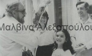 Από τη σεμνή υποδοχή του Γιάννη Ρίτσου στην Κόρινθο, 30/5/1987. Η 8χρονη Αριστέα Κοντόζογλου προσφέρει την ανθοδέσμη ενώ διακρίνονται η φιλόλογος Νότα Στεφανοπούλου και ο ηθοποιός Αποστόλης Σφυράκης.