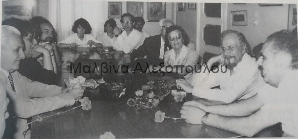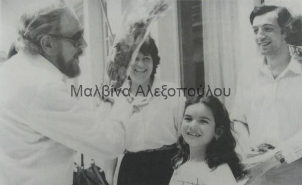 Από τη σεμνή υποδοχή του Γιάννη Ρίτσου στην Κόρινθο, 30/5/1987. Η 8χρονη Αριστέα Κοντόζογλου προσφέρει την ανθοδέσμη ενώ διακρίνονται η φιλόλογος Νότα Στεφανοπούλου και ο ηθοποιός Αποστόλης Σφυράκης.