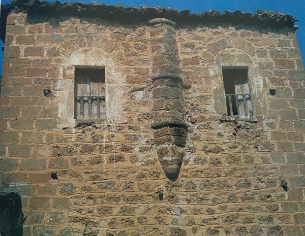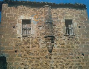 όψης πέτρινου σπιτιού. Ο άξονας τονίζεται με την προεξοχή του τζακιού από τον