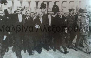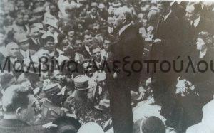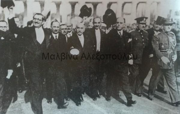 Ο Παναγής Τσαλδάρης περιστοιχιζόμενος από πληρεξούσιους της Ε’ Εθνικής Συνελεύσεως εισέρχεται στο Παναθηναϊκό Στάδιο επευφημούμενος από τον λαό κατά την τελετή ορκωμοσίας των ενόπλων δυνάμεων, μετά την μεταπολίτευση του 1935.