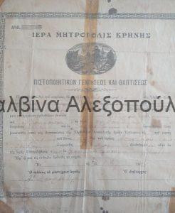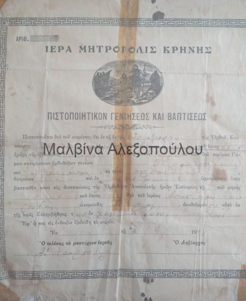 Το παρακάτω έγγραφο πιστοποιεί τη γέννηση καθώς και τη βάφτιση του Τσ. Π. το 1921.